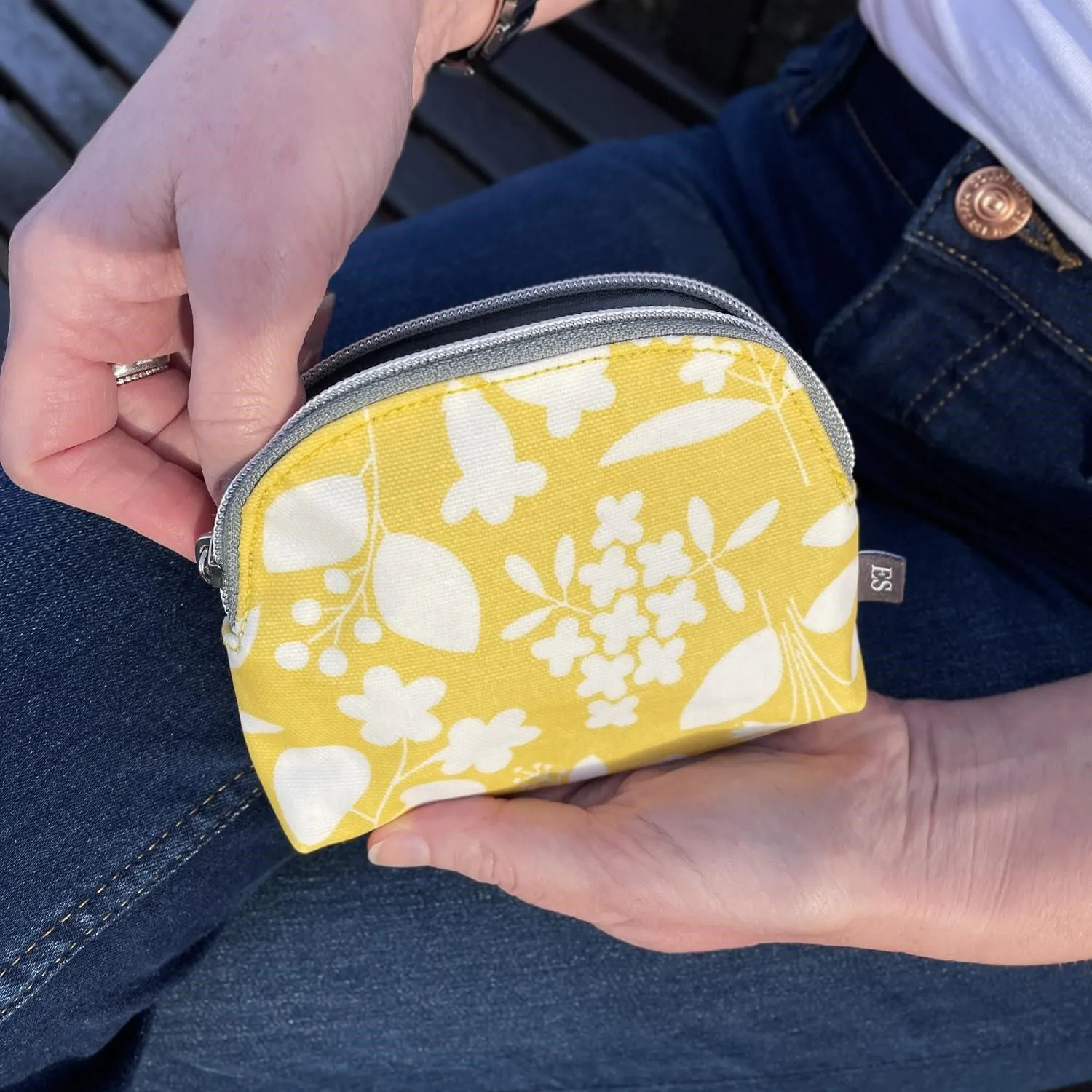 Cute little oil cloth coin purse, simple single zipped compartment with a zipped curved top.